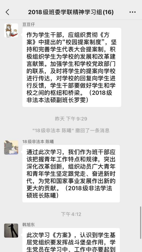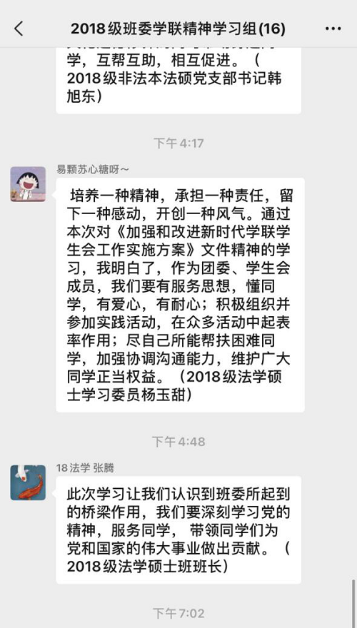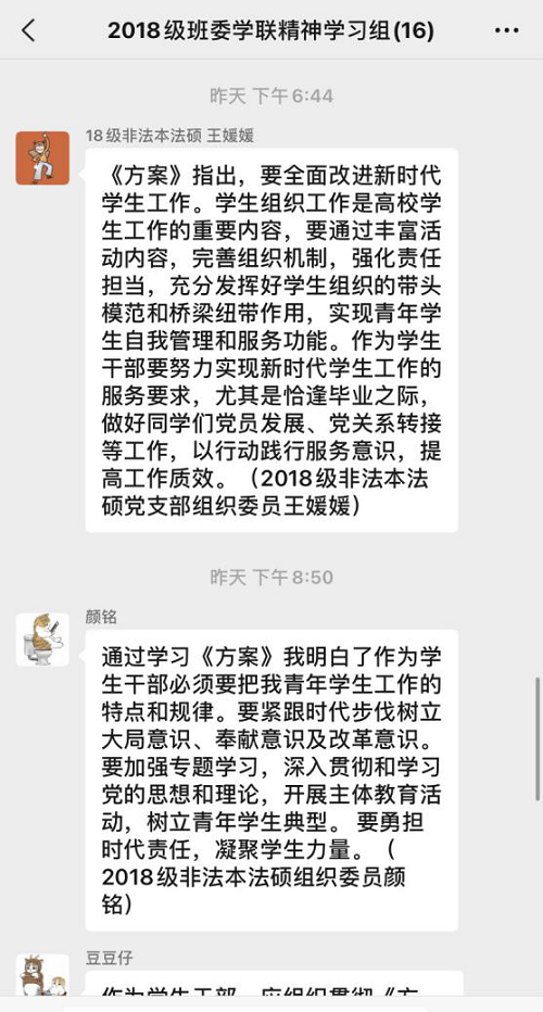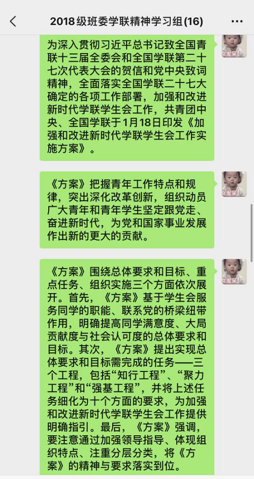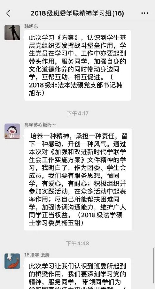班委在微信群就《学联学生会工作实施方案》展开了交流学习,在会议讨论中大家都畅所欲言,从我们作为班委的角度出发,讨论了对《方案》中个别条款的想法以及具体实施建议。其中就学生干部为何以及如何杜绝“官僚化”现象进行了讨论,作为学生干部的我们应找准自身定位,心中时刻铭记我们是为同学服务的群体,要谦虚要接地气更要充当好五楼自拍