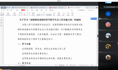 2021年2月5日,2019级法本法硕班开展了一次关于新时代学联学生会工作的系统学习, 自己作为班级的一员,同时作为班级的班干部,接下来我将分享一下自己学习《加强和改进新时代学联学生会工作实施方案》的心得体会。"知行工程"是我在学习过程中始终活跃于脑袋中的一个词汇,它要求我们做到有知且有行,在学生工作上理论学习与实践行动要始终保持一致,自己作为班级的学习委员,也一直秉持着这样的理念,希望自己在班级同学与老师中搭建好学习沟通的桥梁,学习之余,也积极创新班级的活动方式,增加与同学的交流,目的在于创新式的为班级同学服务!