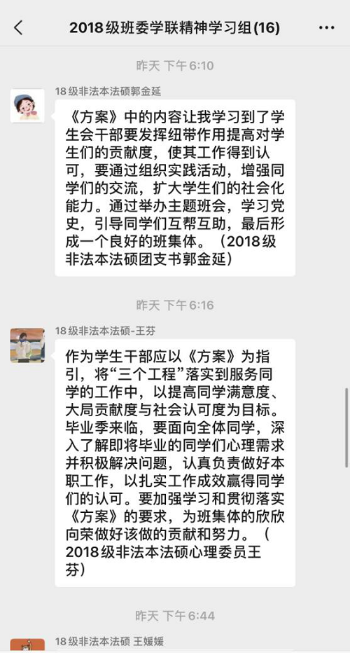 通过深入学习《加强和改进新时代学联学生会工作实施方案》,对习近平总书记关于青年工作的重要思想和关于教育的重要论述有了进一步的了解和认识,我明白了党支部活动的开展不能脱离青年学生活动的特点和规律,要着力服务于广大同学的普遍性需求,要不断提升同学满意度、大局贡献度和社会认可度。因此,在日后的党支部活动中,法本法硕班将紧紧围绕这三个要求,在丰富活动载体的同时寓教于乐,使得党员同志深入学习贯彻习近平新时代中国特色社会主义思想,学习党史、新中国史、改革开放史、社会主义发展史,将爱国爱党和爱社会主义高度统一。