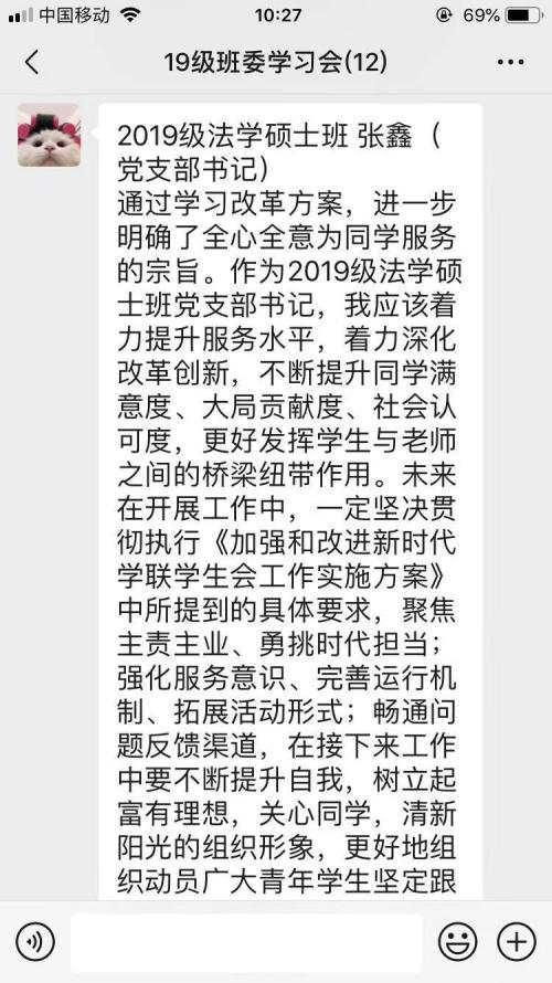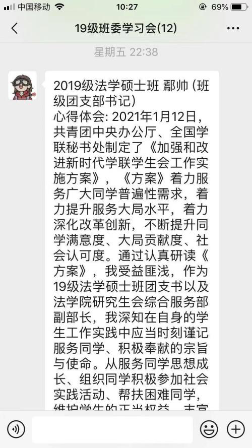 2021年1月12日,共青团中央办公厅、全国学联秘书处制定了《加强和改进新时代学联学生会工作实施方案》,《方案》着力服务广大同学普遍性需求,着力提升服务大局水平,着力深化改革创新,不断提升同学满意度、大局贡献度、社会认可度。通过认真研读《方案》,我受益匪浅,作为19级法学硕士班团支书以及五楼自拍