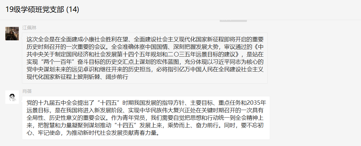 2019级法学硕士党支部于2020年12月27日在线上召开了“学习十九届五中全会会议内容”的线上学习探讨活动。本次会议由2019级法学硕士党支部书记张鑫主持,支部内各党员参加了此次会议。