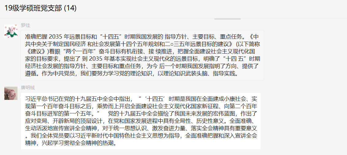而鄢帅同志也通过自己对十九届五中全会的内容及重要意义的学习提出自己的理解看法:党的十九届五中全会于2020年10月26日-29日在北京召开,全会充分肯定了“十三五”时期党和国家取得的历史性成就,审议通过了“十四五”发展规划和2035年远景目标建议,科学回答了我国发展中的一系列重大理论和实践问题,为我们做好未来五年乃至更长时间工作提供了重要遵循,对于实现第二个百年目标、实现中华民族伟大复兴的中国梦,具有十分重大的现实意义和深远的历史意义。在我们的学习生活中,要从中汲取奋勇前行的强大动力,在“十四五”引领下规划好自己的“路线图”和“时间表”,立足当前、着眼长远,锚定目标、稳扎稳打,不断适应时代要求,提高个人素质水平。关于此次会议讨论,大家都非常积极地发表了自己的看法。