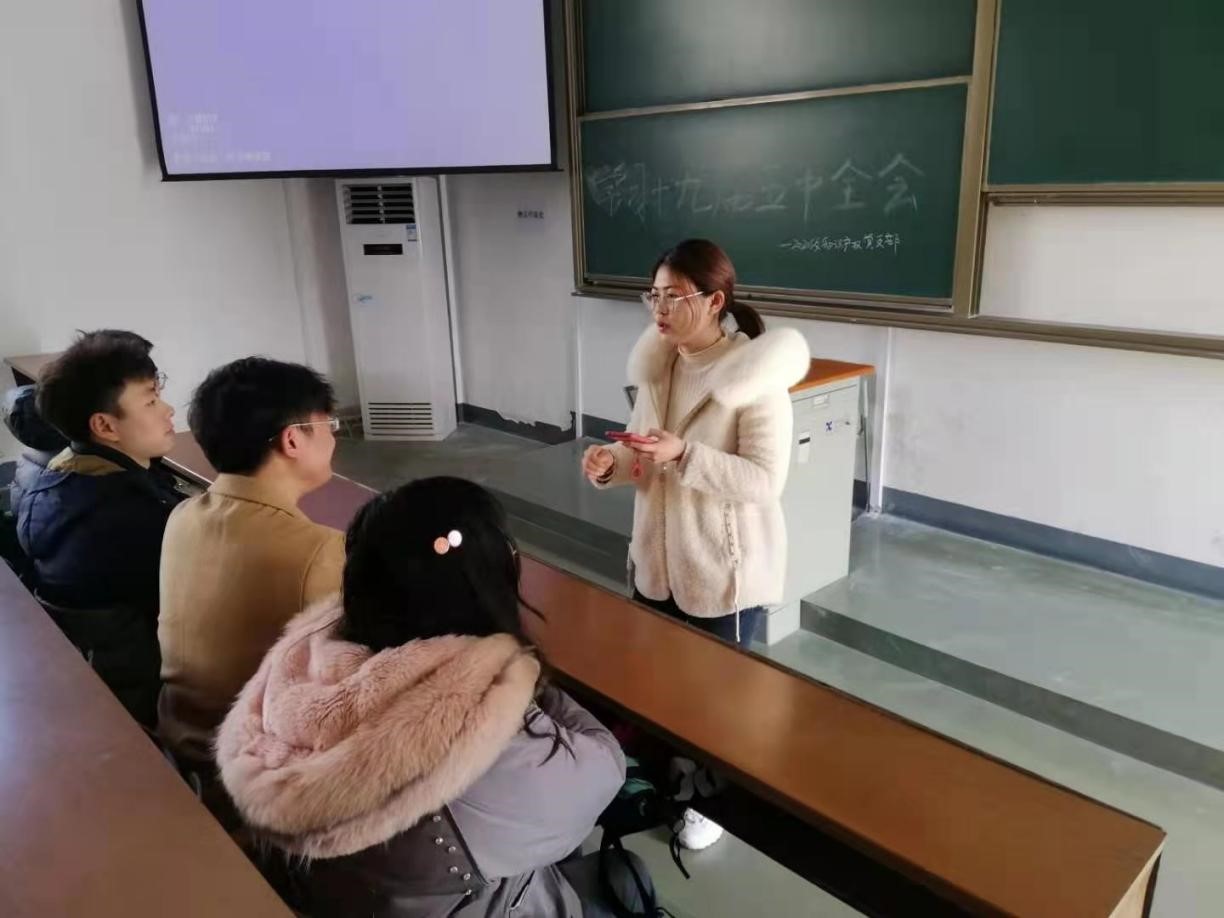 黄格同志从党的十九届五中全会基本概况;深刻认识我国进入新发展阶段的重要意义、有利条件和重要特征;准确把握2035年远景目标和“十四五”时期我国发展的指导方针、主要目标、重点任务;牢牢把握构建新发展格局的战略构想和重要着力点以及坚持党的全面领导,动员各方面力量为实现“十四五”规划和2035年远景目标而团结奋斗五个部分进行讲述。此外,黄格同志表示党的十九届五中全是在面对错综复杂的国际形势、艰巨繁重的国内改革的背景下所召开的一次具有重大意义的会议。本次会议召开展示出了全党全国各族人民紧密围绕团结在习近平同志为核心的党中央周围,奋力夺取全面建设社会主义现代化国家新胜利的决心。作为青年学子,我们对于自己所处在的这样一个充满机遇和挑战的时代,更要有使命感和责任感。正如习总书记对我们青年学子勉励的那样,不负时代,不负韶华、不负青春,为全面建设社会主义现代化国家积蓄力量!