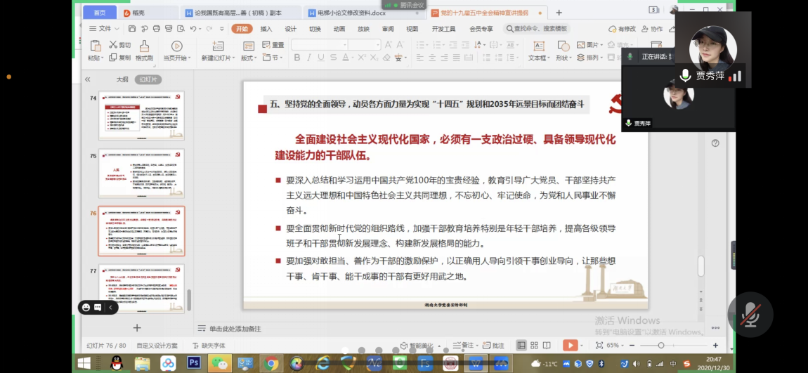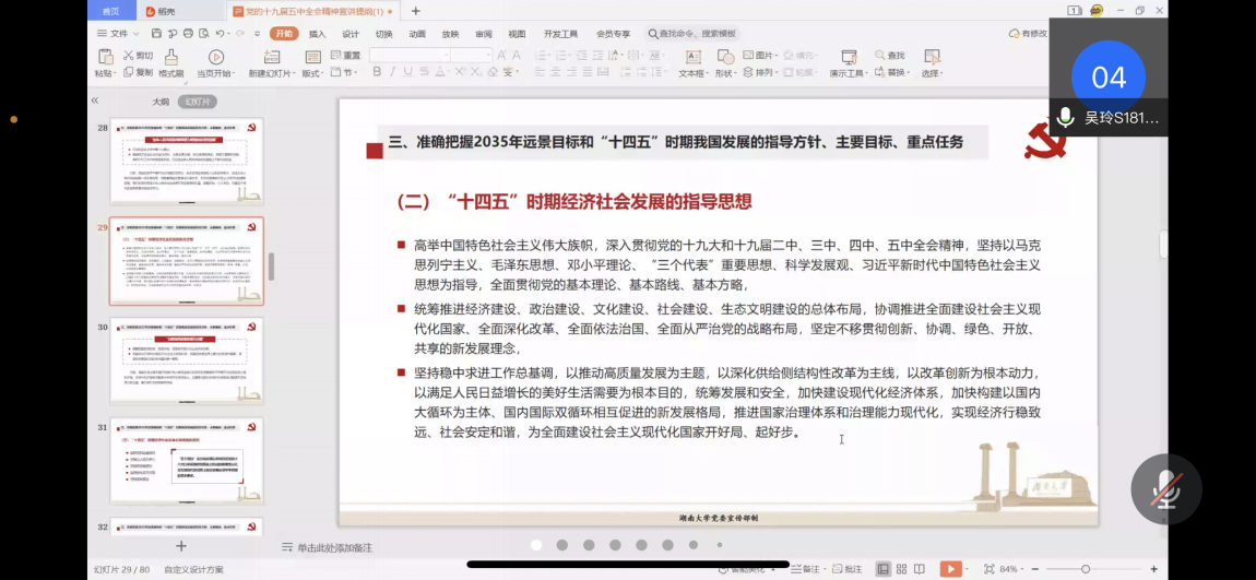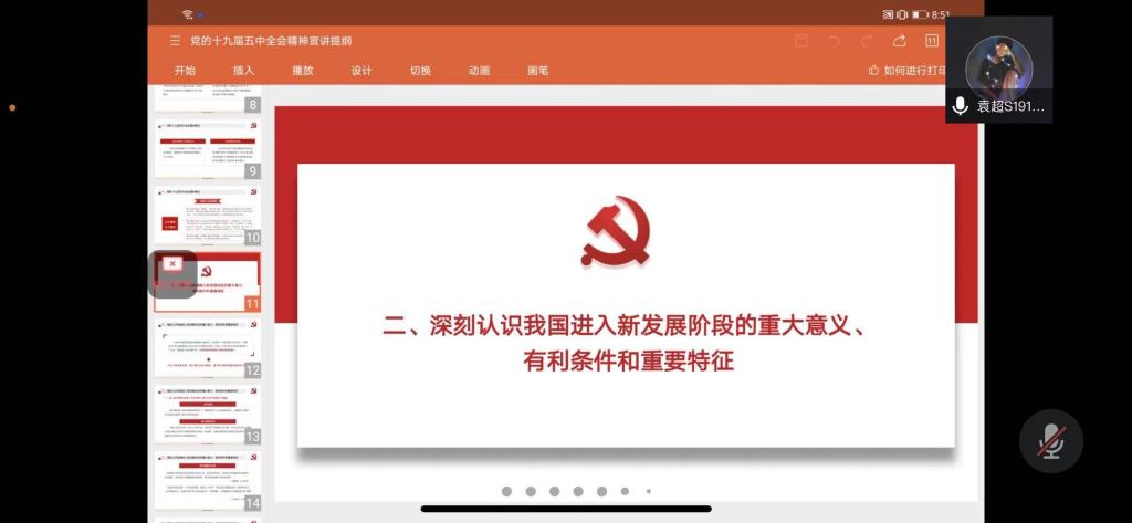 此次活动采取分组学习的模式,针对十九届五中全会精神展开深入学习。党支委提前将本支部同志分成五个小组,每个组对自己模块的内容进行消化吸收,选出一名同志代表本组为大家讲解此模块的内容,通过共享屏幕、打开麦克风的方式进行讲解,每位小组讲解时间5-10分钟。如果模块内容过多可选择重点难点讲解。