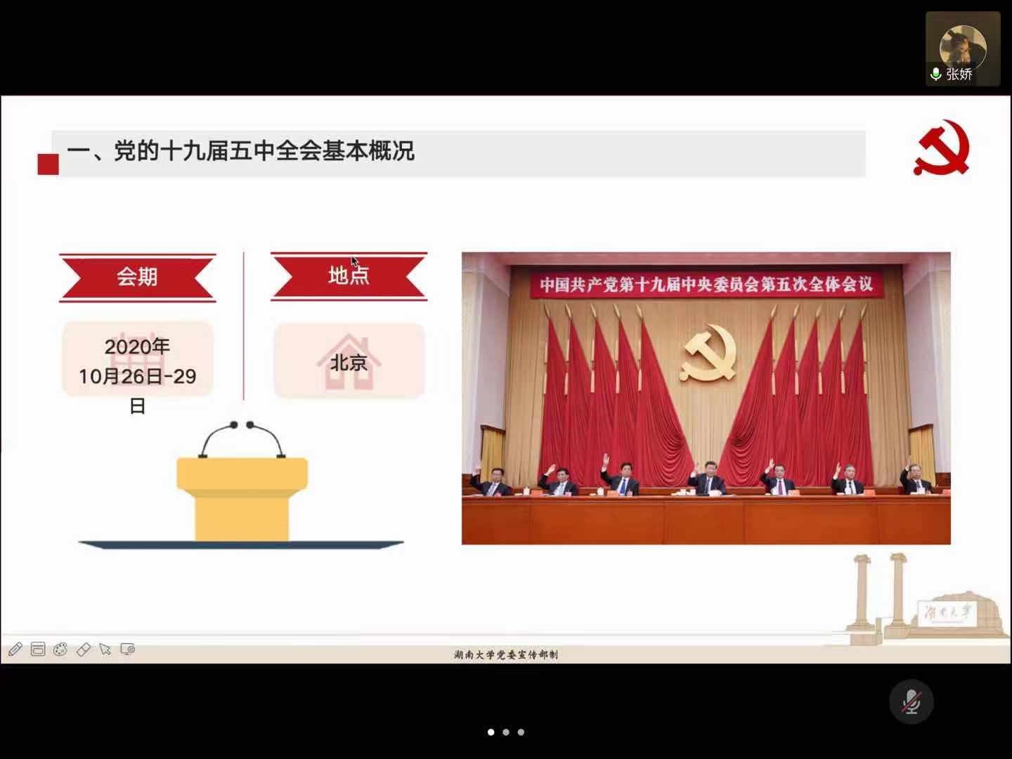 第一组代表张娇同志为大家讲解了党的十九届五中全会基本概况,主要围绕会议的时间、地点、参会人员、主要议程及《建议》的起草和基本架构展开。