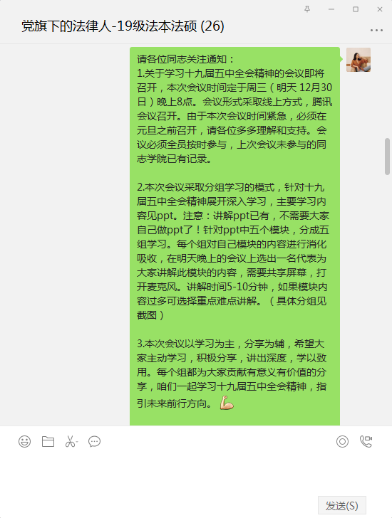党委工作部署,2019级法律硕士(法学)党支部决定于2020年12月30日20点开展学习十九届五中全会精神活动。