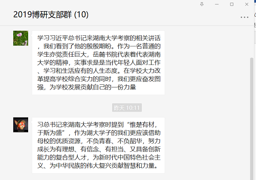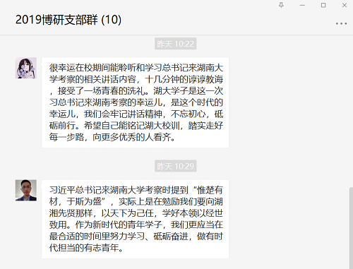 2019级博士研究生党支部进行了集体讨论学习,本次会议以网络会议形式召开,会上,支部成员结合个人学习和工作实践体会,就习主席重要讲话精神展开深入讨论,并彼此分享个人心得体会。
