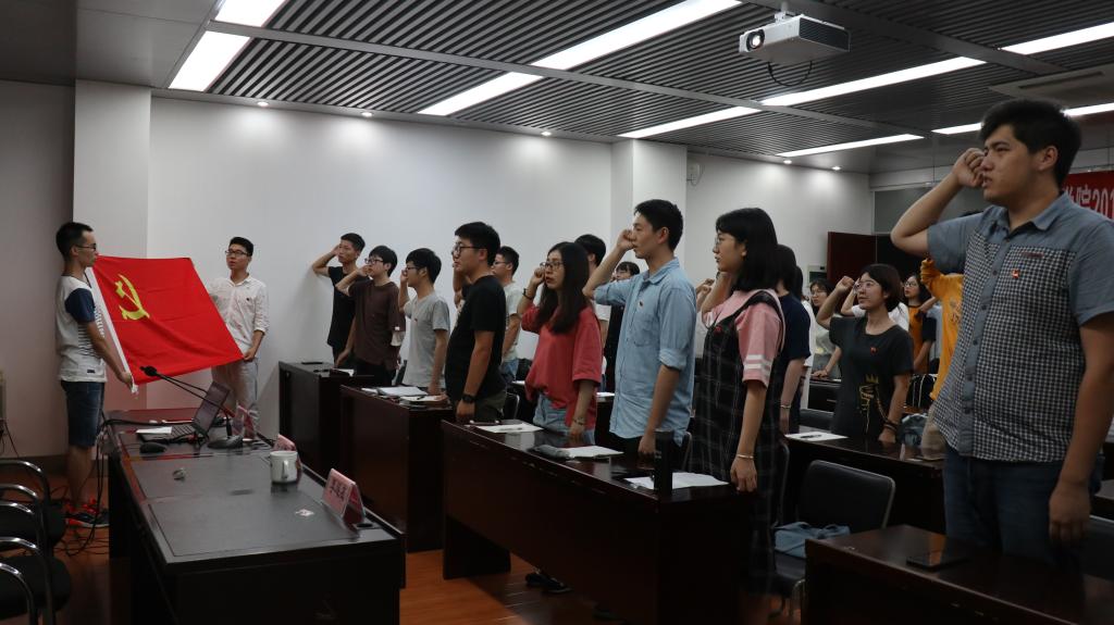 “我志愿加入中国共产党,拥护党的纲领,遵守党的章程,……”面对鲜红的党旗,全体党员同志重温入党誓词,铿锵的誓词表达了同学们不忘初心,牢记使命,忠诚为党,不懈奋斗的坚定誓言,表达了同学们在新的学习和工作岗位上努力学习,积极工作,再创辉煌的坚定决心。