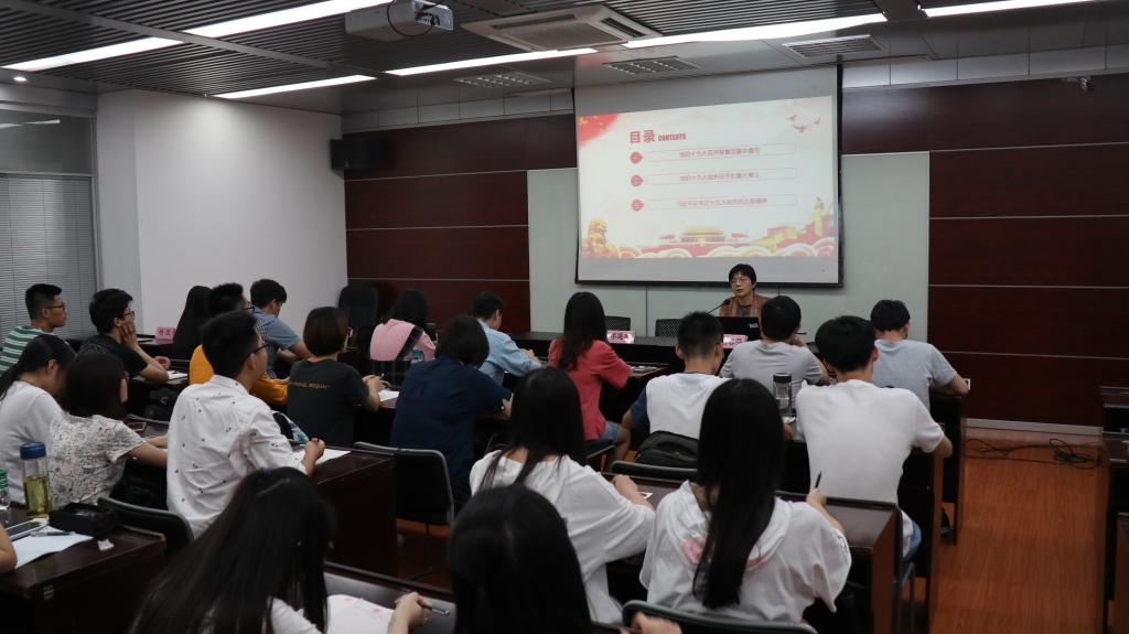 党委副书记、副院长付蓉芬以“学习宣传贯彻党的十九大精神和习近平新时代中国特色社会主义思想”为题,为毕业生主讲了一堂精彩的党课。付书记首先带领大家回顾历史,引用毛泽东、邓小平和习近平三位领导人的语录,介绍了在我们党的带领下中国经历站起来、富起来再到强起来的光辉历程,同时从小康建设的未来“两步走”方针、坚持改革开放的经济发展战略、齐心共筑中国梦的伟大目标以及中国正逐步走向世界舞台中心的外交成就等方面论证了中国特色社会主义建设已经进入了新时代的理念,其与大变革、大发展、大融合以及世界充满不确定性与不稳定因素的时代特点共同构成了党的十九大的召开背景。