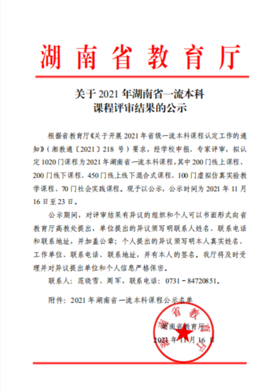 近期,湖南省教育厅发布了《关于公布2021年省级一流本科课程评审结果的通知》,五楼自拍