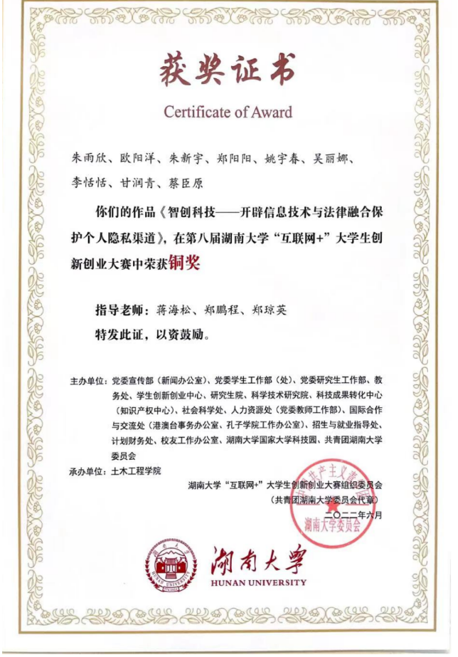 1905班朱雨欣同学主持申报,蒋海松、郑鹏程、郑琼英老师指导的项目“智创科技——开辟信息技术与法律融合保护个人隐私渠道”获得铜奖。本次获奖展示了五楼自拍