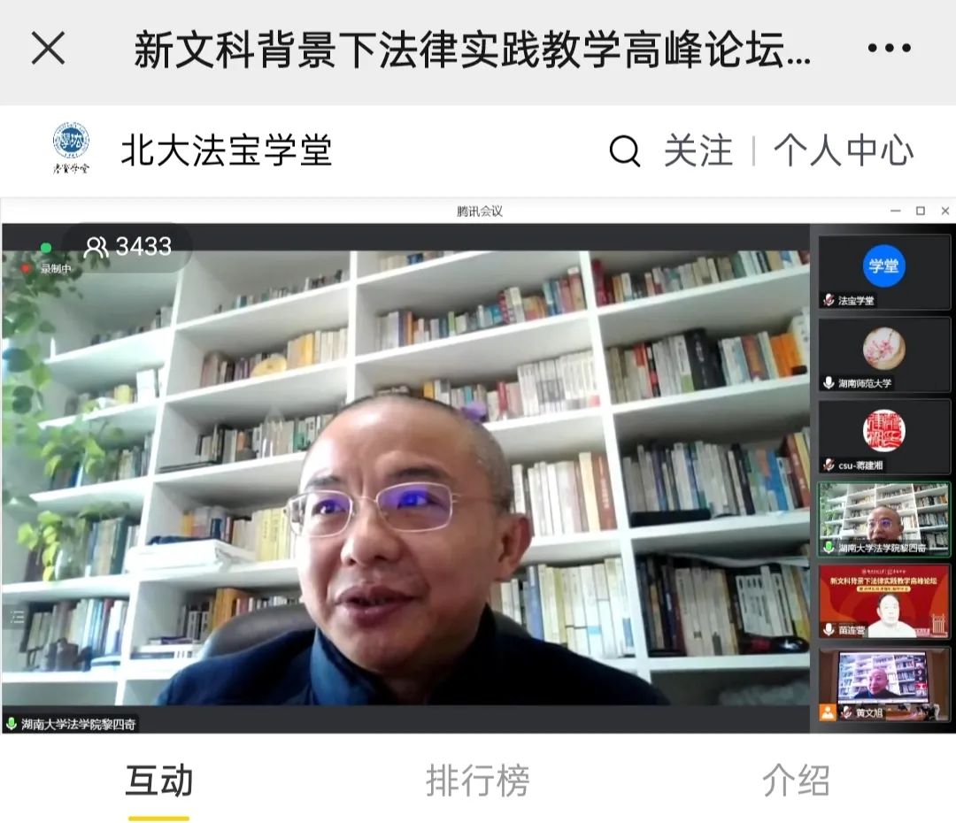 院长黎四奇教授就“新文科背景下法律实践教学暨法律实务课程标准”等相关主题参会与谈分享。 他介绍了五楼自拍