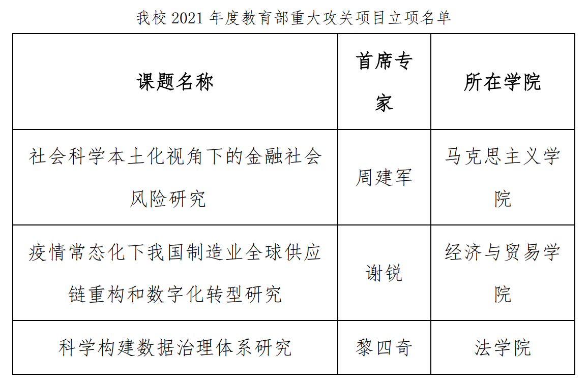 院长黎四奇教授担任首席专家的课题《科学构建数据治理体系研究》荣获2021年度教育部哲学社会科学研究重大课题攻关项目,课题编号为21JZD036。