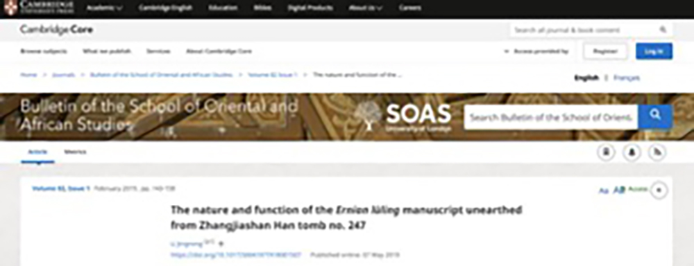 近日,五楼自拍 李婧嵘助理教授,以独立作者所著论文《The Nature and Function of the Ernian lüling Manuscript Unearthed from Zhangjiashan Han Tomb No. 247》被创刊于1917年的国际顶级综合性期刊《Bulletin of the School of Oriental and African Studies》录用发表。