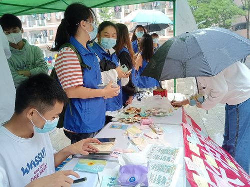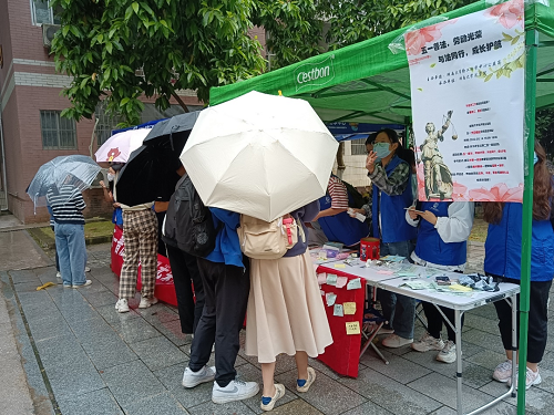 公益岗将问卷中大家普遍关心的劳动法律问题及解答制作成精美的普法宣传单,由志愿者们向路过的同学分发,并向他们讲解有关的劳动法律知识,实用、简明的知识干货很快吸引了不少同学前来参与活动。