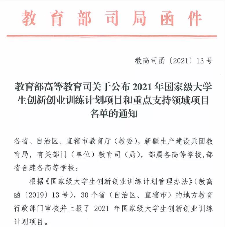 2021年8月24日,教育部高等教育司公布了2021年国家级大学生创新创业训练计划项目名单,五楼自拍