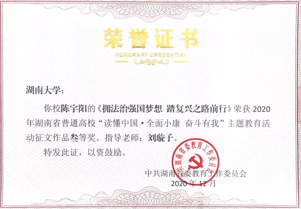 获评优秀组织奖,多位2018级本科生获不同级别奖项。1805班陈宇阳征文作品《拥法治强国梦想 踏复兴之路前行》获教育厅三等奖及五楼自拍
