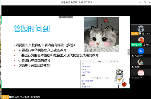 为贯彻落实习近平总书记关于疫情防控的重要指示,进一步加强同学们的防疫抗疫意识,,3月29日晚,法学1903班举行“共抗疫情爱国力行”线上主题班会活动,会议由班长张思主持,班主任汪叶老师和全体同学参加班会。