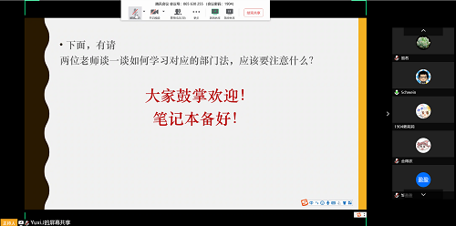 为帮助同学们更好地进行专业学习,疫情期间能够有效地汲取知识,真正做到不让疫情迟滞学习的步伐,班主任金昱茜老师特邀刑法科任老师熊亚文和行政法科任老师展鹏贺一起和同学们就疫情下如何学习进行座谈。金老师依据班级同学们的学习成绩对上学期班级学习情况进行了总结和分析,在法学学习方法方面为同学们提供意见和建议,并答疑解惑。她强调,同学们应当立足现在、总结过去,设立目标,法学学习更多为方法经验的积累,应当以专注、认真的态度对待学习,鼓励同学们在今后的学习中积极思考、善于发问。随后熊老师和展老师分别就刑法和行政法的法律理念、基本原则、知识难点、学习方法等问题进行指导,同学们对二位老师的参会表示热烈欢迎,同时就自身的困惑提出疑问。熊亚文老师和展鹏贺老师对大家提出的问题耐心讲解,增强了同学们的学习兴趣和信心。