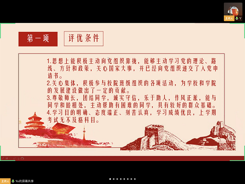 会议伊始,喻涛滔从思想上、学习上、工作上等几个方面,宣读本次入党推优大会的评优条件,给在场学生提供标准,让学生在接下来的演讲环节可以全面地考量,进而作出准确的判断。