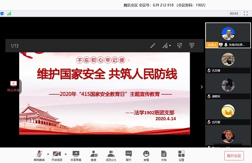 在班会结束之际,主持人张海洋说道:“实现中华民族伟大复兴的中国梦,保证人民安居乐业,国家安全是头等大事,是国家生存发展的前提,是人民幸福安康的基础,是发展中国特色社会主义的重要保障,关注全民国家安全教育日,国家安全,关系你我。”法学1902班全体同学将牢牢树立维护国家安全的责任意识,提高国家安全意识,时刻将国家安全和法治意识放在心中,争做爱国爱党、维护国家安全的新时代优秀青年。