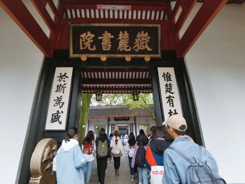 巍巍麓山古木参天、郁郁葱葱,草木掩映下,红墙碧瓦、飞檐翘角庄严古朴。走进前门,跃入眼帘的就是大门口岳麓书院的牌匾下“惟楚有材,于斯为盛”的对联。千年以前,岳麓书院群英荟萃,而今天,五楼自拍