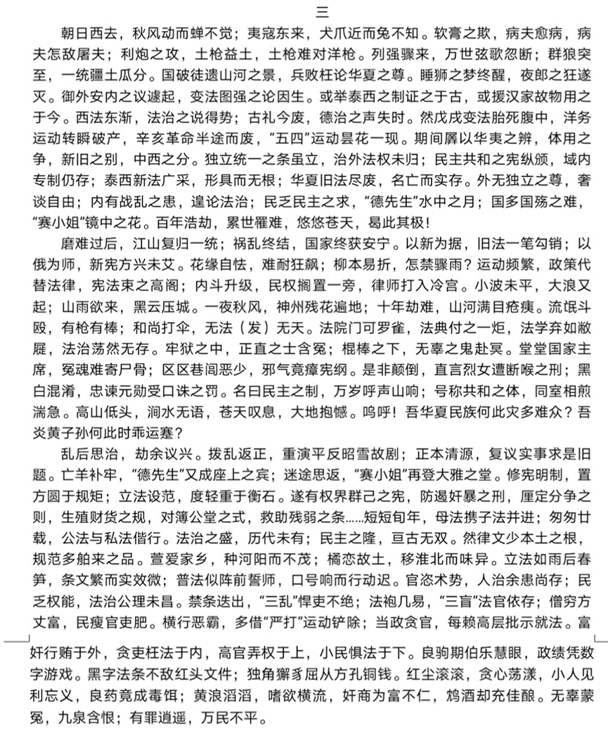 磨难过后,江山复归一统;祸乱终结,国家终获安宁,作者在第二小段这样写到。然而好景不长,柳本易折,怎禁骤雨?理念与制度的不平衡导致了一些问题。十年内乱,让我国法治建设倒退几十年;贪官盛行,让百姓不平。还真是“黑字法条不敌红头文件;独角獬豸屈从方孔铜钱。”