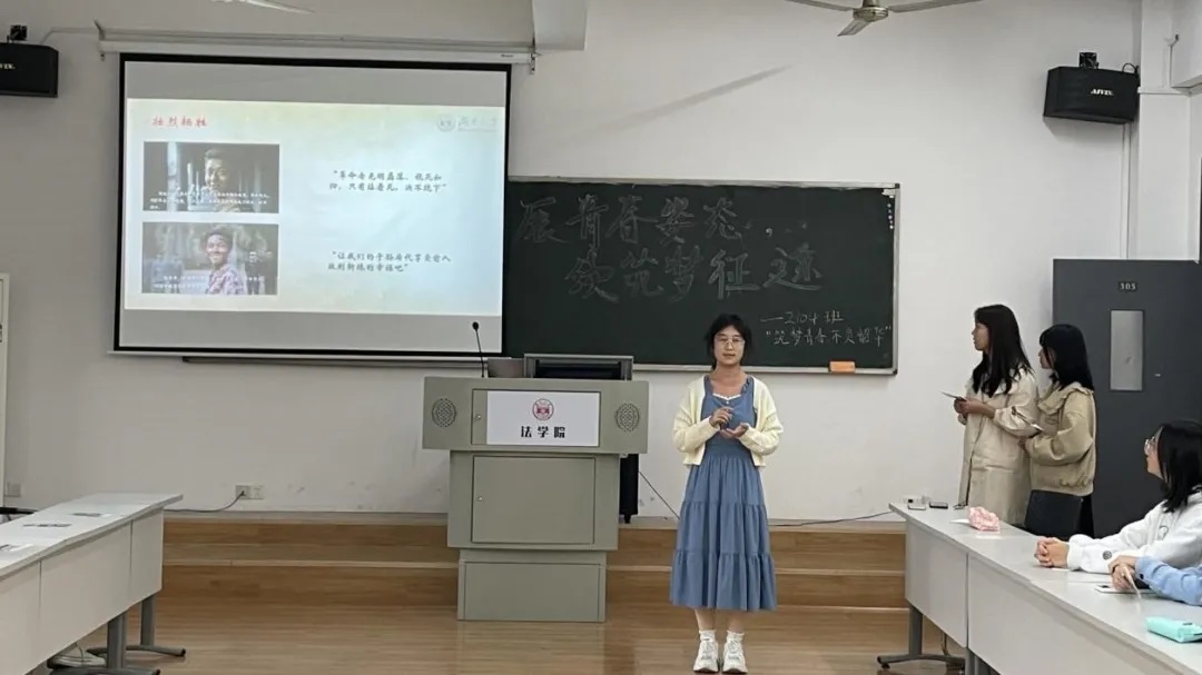 小组分享结束后,班会进行第二项:慎而思之,勤而行之。班主任和学长学姐为同学们送上青春寄语。首先,班主任郭哲老师与同学们分享自己的青春故事,并对同学们近期的学习生活状况表达了关心。她希望同学们在目前的大学阶段能注重基础知识的积累,避免过度焦虑,一步步发现法学之魅力。由于课程冲突,受邀参加此次班会的喻涛滔学长、刘静雯学姐未能到场,其寄语分别由班长张宇翔、团支书张伟浩代为朗读。其中“如果此刻你如愿以偿,那就:希望此刻不要成为你人生的巅峰。如果此刻事与愿违,那就:悟已往之不谏,知来者之可追”“站在人生新的起点,面对日新月异的时代浪潮,我们每个人都是时代下的产物,但命运和机遇却也掌握在我们自己的手中”的语句让同学们感触颇深。