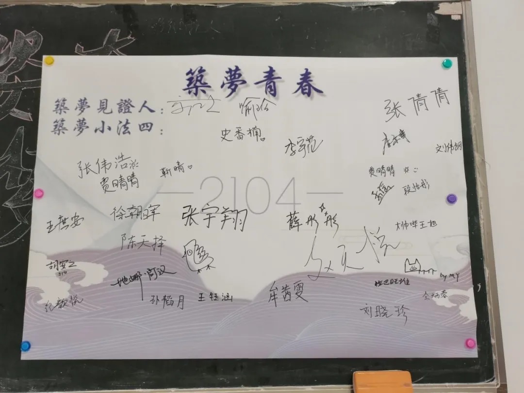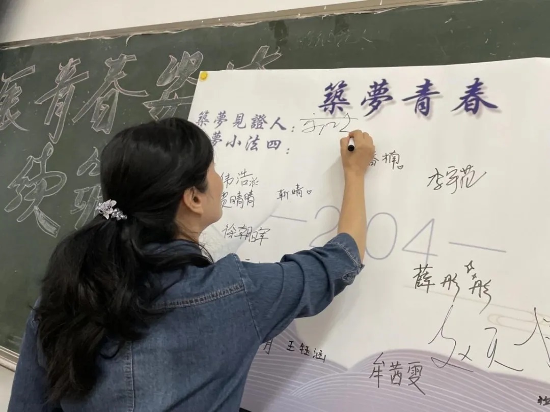 很快,班会进程来到第四项:以梦为马,不负韶华。全体同学将写上了自己梦想的明信片放入时空胶囊保存,并在签名墙上签下自己的名字,两位老师作为见证人也一同签名并分别写下了对同学们的期许。