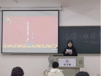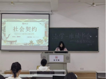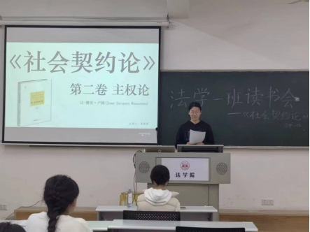 303教室举行《社会契约论》读书会。《社会契约论》是法国思想家卢梭创作的法学名著,被列为“启蒙运动三书”之一,本书对于法律的探讨,能帮助同学们扩展法律视野,引导同学们进行学术性思考,对同学们具有启示意义。读书会邀请班主任李婧嵘老师指导点评,学习委员焦思潼同学主持,张炀、李敏学、邹艳萍和费文涛四位同学作为主讲人,法学2301班全体同学参与。大家各抒己见,在自由讨论的氛围中了解同学们多元的看法,提升了思维和说理能力。