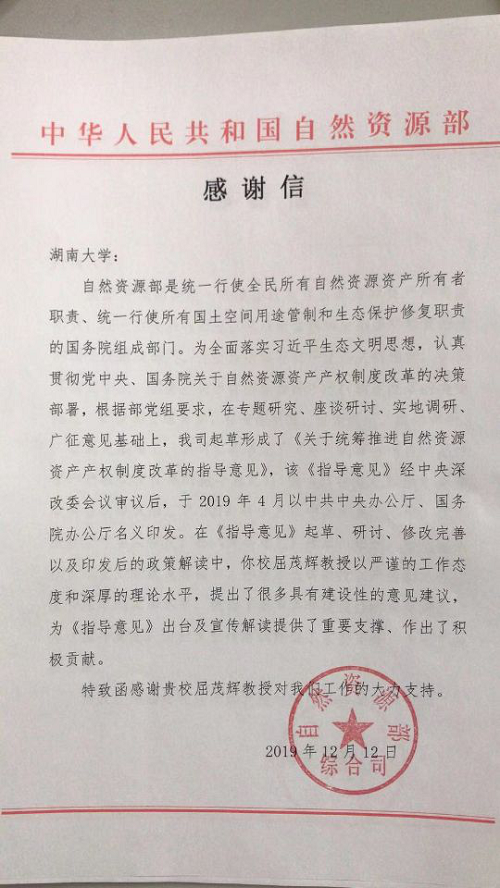 自然资源部综合司在感谢信中赞扬道:“在《指导意见》起草、研讨、修改完善以及印发后的政策解读中,你校屈茂辉教授以严谨的工作态度和深厚的理论水平,提出了很多具有建设性的意见建议,为《指导意见》出台及宣传解读提供了重要支撑、作出了积极贡献。特致函感谢贵校屈茂辉教授对我们工作的大力支持。”