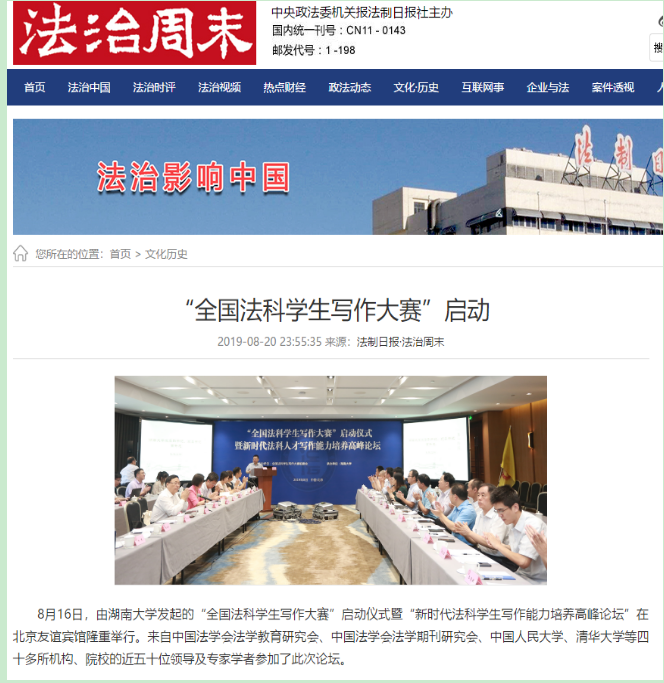 发起的“全国法科学生写作大赛”启动仪式暨“新时代法科学生写作能力培养高峰论坛”在北京友谊宾馆隆重举行,写作大赛的成功启动引发全国媒体密集报道。