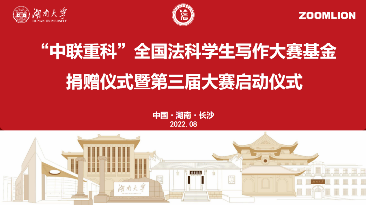 中联重科股份有限公司创立于1992年,是全球领先高端装备制造企业,业内首家A+H股上市公司,工程机械的领头羊,主要从事工程机械、农业机械等高新技术装备的研发制造,以“思想构筑未来”为文化旗号。支持全国法科学生写作大赛,也展现了中联重科服务于全面依法治国战略、弘扬湖湘文化的社会责任与担当。“思想构筑未来,写作传承文明”,由其冠名写作大赛也是珠联璧合的公益佳话。
