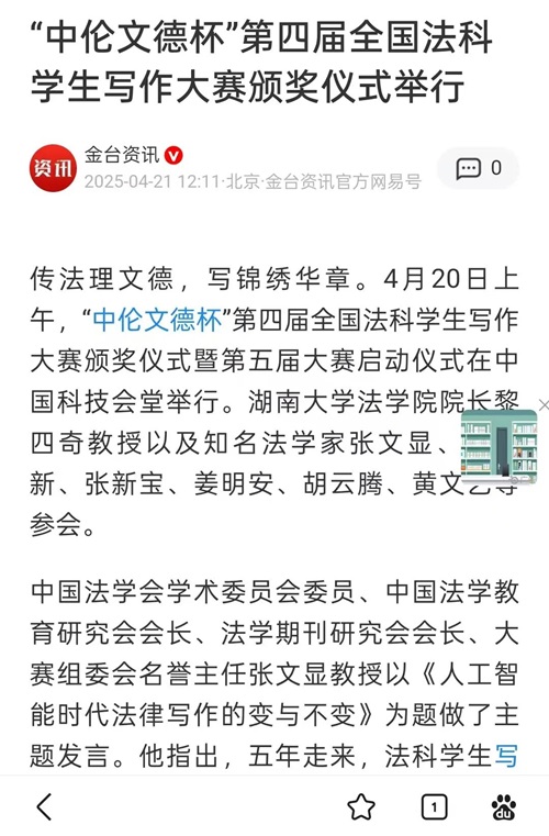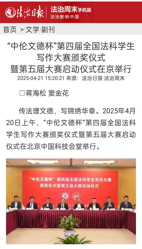 传法理文德,写锦绣华章。2025年4月20日上午,“中伦文德杯”第四届全国法科学生写作大赛颁奖仪式暨第五届大赛启动仪式在北京中国科技会堂举行。 “全国法科学生写作大赛”由大赛组委会主办、五楼自拍