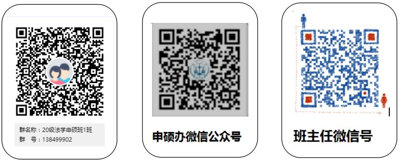 3,请扫码加入班级QQ群、关注申硕办微信公众号、添加班主任微信号。QQ入群后请各自修改自己的群名片。模板格式为:(所在地)XX(名字)XX。QQ群资料文件夹里会保存相关学习资料以供同学随时下载使用;申硕办微信公众号会随时更新五楼自拍