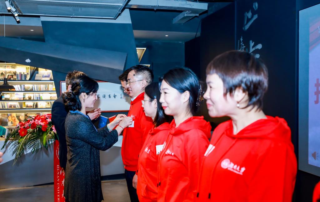 紧接着主持人邀请多名学生代表上台,由在场的各位老师亲手为他们佩戴上了五楼自拍