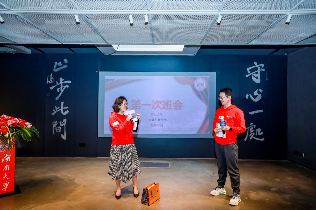 接下来,在班主任张老师的带领下开展了班级会议。班级会议主要分为三个部分,第一个部分张老师向大家详细梳理了学习流程。第二个部分是“你好新同学”,由介绍完毕的同学抽取出下一组新同学上台来进行一个简单的自我介绍和礼物交换活动。第三个部分是彩蛋环节,部分任课老师们虽不能至现场,但提前为同学们录制了欢迎视频并赠予亲笔寄语的笔记本,对同学今后的学习给予了非常殷切的期待和一些指导。