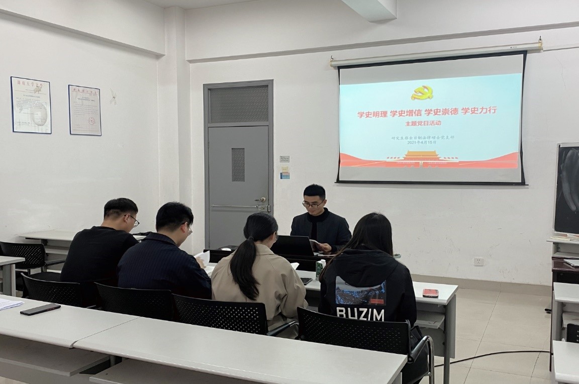 会议主要包括三个环节:全体党员重温入党誓词、集体学习《中国共产党简史》、观影学史。宣传委员邓媚文同志结合自身实际工作,分享其对“学史明理 学史增信 学史崇德 学史力行”的理解。她指出:欲知大道,必先为史。历史是一个民族安身立命的基础,中华民族向来重视历史,并善于从历史中总结经验、汲取智慧。党的历史是最生动最有说服力的教科书,是中国共产党最宝贵的精神财富。作为新时代的一名学生党员和律师,要全身心投入党史学习教育中,做到学有所思、学有所悟、学有所得。