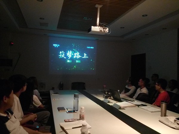 晚上六点半,观影活动正式开始。“《筑梦路上》是中央宣传部等单位为庆祝建党95周年联合摄制的32集大型文献纪录片。该片以95年来中国共产党领导中国人民进行的革命、建设、改革的伟大历程为叙事线索,选取了历史上的数十件大事件,为我们展现了近代以来在中国人民在中国共产党领导下奋力实现中华民族伟大复兴“中国梦”的伟大探索和实践”,党支部组织委员黄青主持活动并介绍了《筑梦路上》这部纪录片的相关情况,使同学们对即将观看的纪录片有了简单的了解。