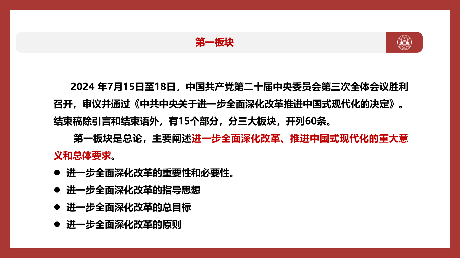 随后,会议进入第二项议程——学习《中共中央关于进一步全面深化改革推进中国式现代化的决定》。在支部副书记的带领下,全体党员认真学习了文件内容,逐字逐句、全面系统地领会了其中的精神实质和丰富内涵。支部副书记总结,学习好、贯彻好党的二十届三中全会精神是当前和今后一个时期全党全国的一项重大政治任务。全体党员要深刻理解习近平总书记关于全面深化改革的一系列新思想、新观点、新论断,将其内化于心、外化于行,切实将思想和行动统一到全会精神上来。