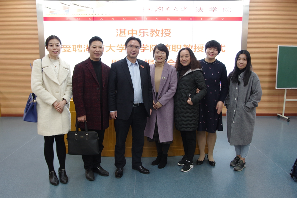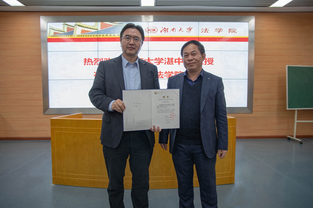 党委书记易骆之为湛中乐教授颁发聘书并为其佩戴校徽。湛中乐教授在致辞中感谢五楼自拍