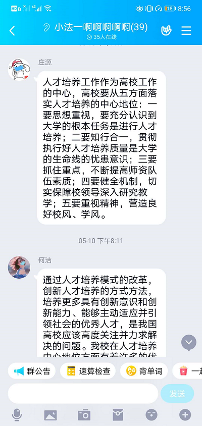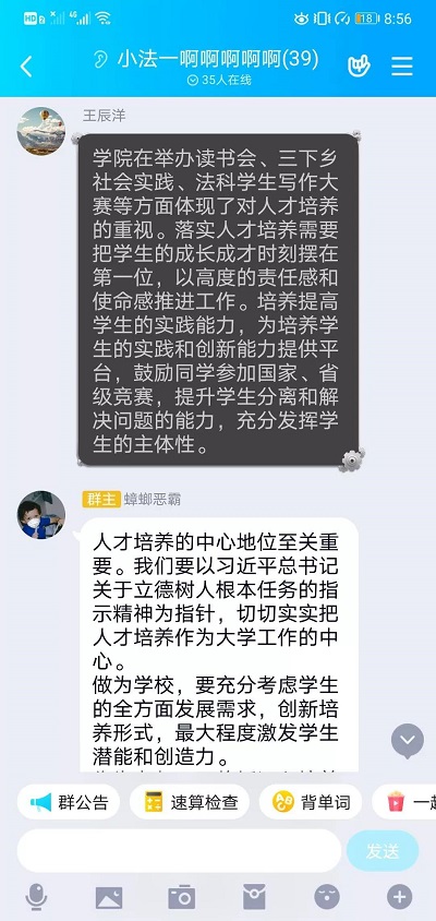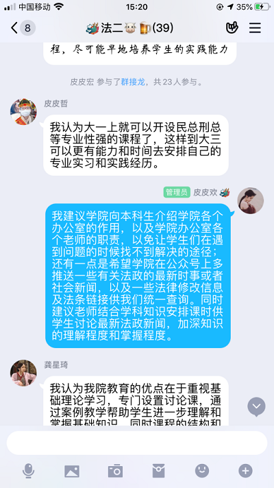 法学1801班于5月10日晚举行了线上班会,同学们积极参与,建言献策。在此次讨论活动中,同学们不仅对五楼自拍