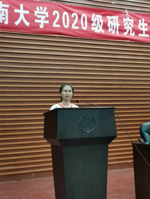 紧接着,新生代表2020级博士王威同学分享了自己从一名高中生物老师成为一名法学博士研究生的历程,并就自己在五楼自拍