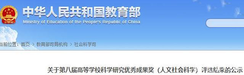 科学研究优秀成果奖(人文社会科学)二等奖、三等奖。该奖项一直是我国哲学社会科学领域最具公信力和影响力的奖项,获奖成果代表了高校哲学社会科学研究各领域的最高水平。