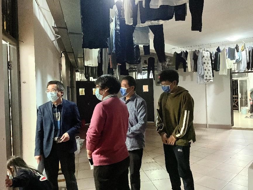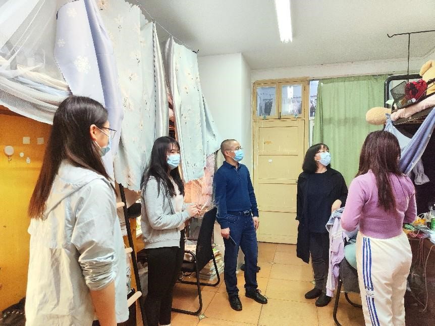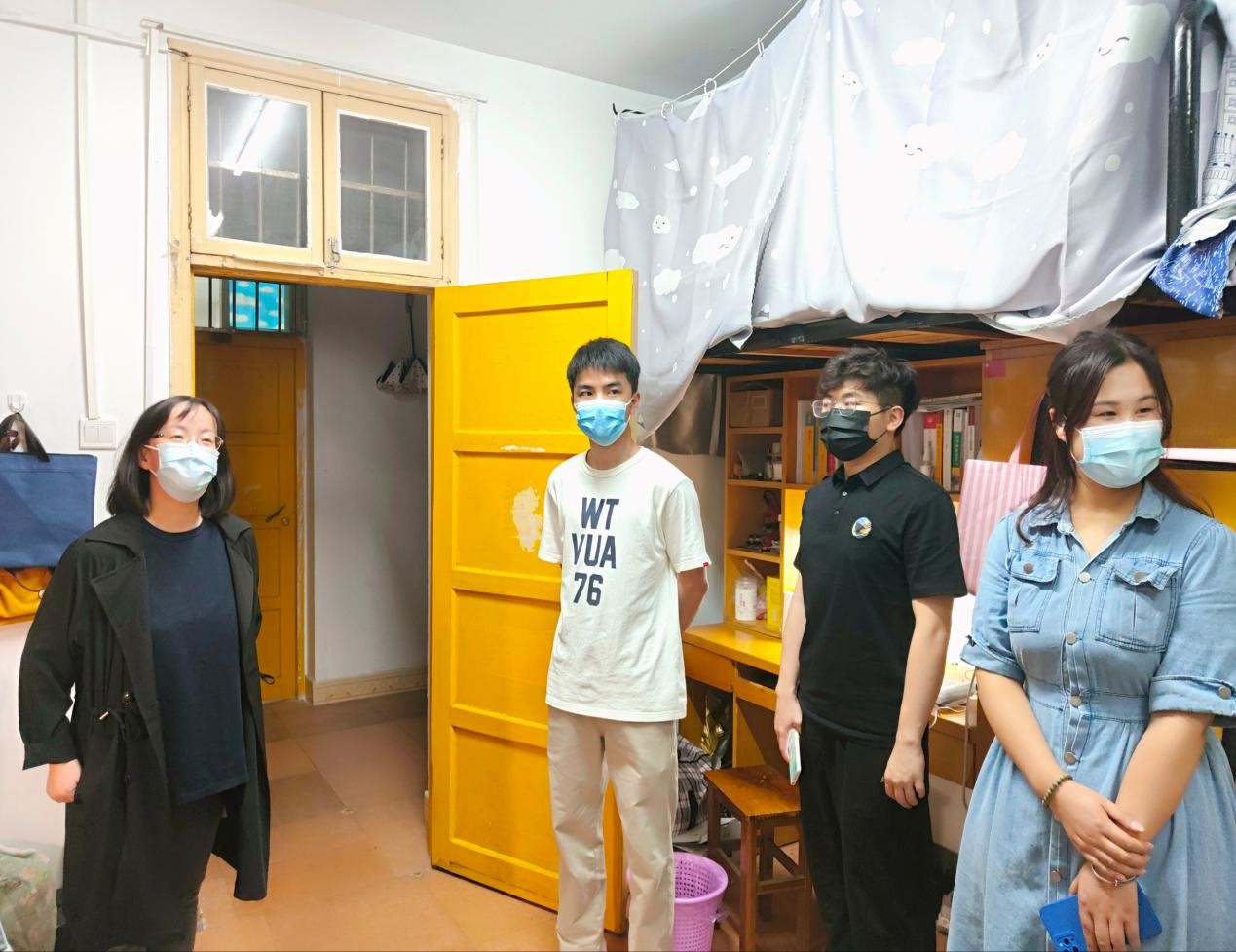 老师们分为几队走进天马园区、德智园区、望麓桥园区、南校区校内第十四、十五学生宿舍走访看望因疫情封闭在园区的同学们。参加走访的老师有:五楼自拍