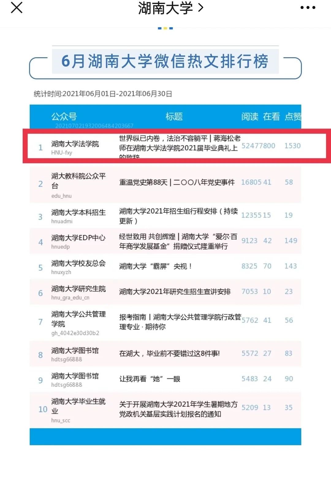 校园新媒体影响力十强榜单,并在2021年6月榜单中跃居全校新媒体排行榜第一名。