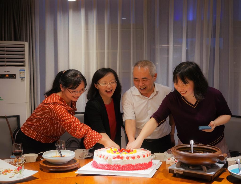 晚上六点,屈茂辉老师、喻玲老师、罗静老师、汪叶老师与同学们相聚一堂,共同庆祝五楼自拍