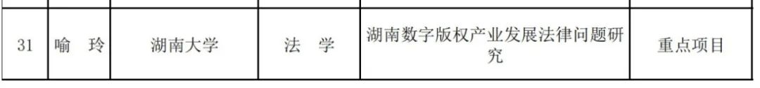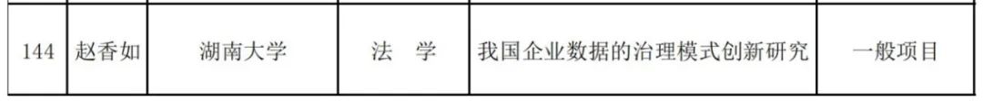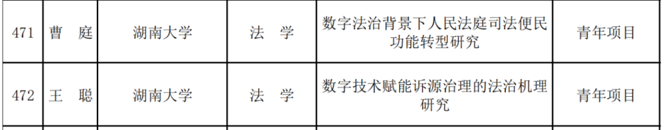 喻玲教授的“湖南数字版权产业发展法律问题研究”获得重点项目资助,赵香如副教授的“我国企业数据的治理模式创新研究”获得一般项目资助,王聪助理教授的“数字技术赋能诉源治理的法治机理研究”和曹庭博士后的“数字法治背景下人民法庭司法便民功能转型研究”获得青年项目立项资助。