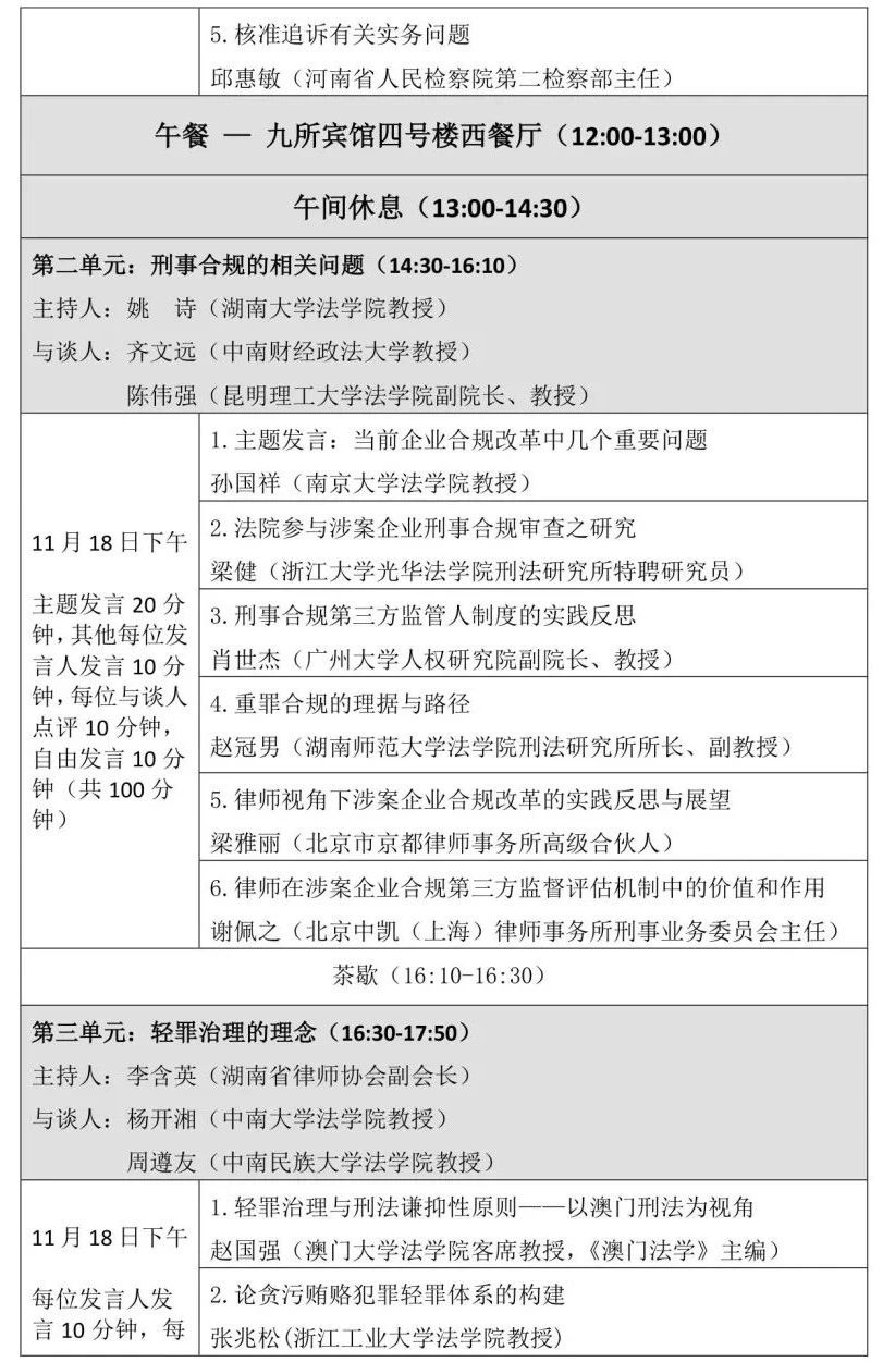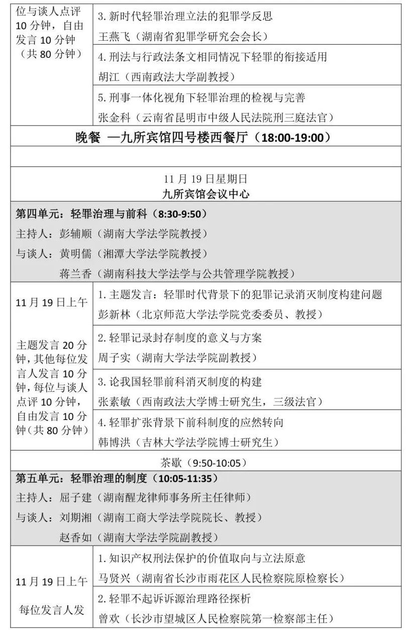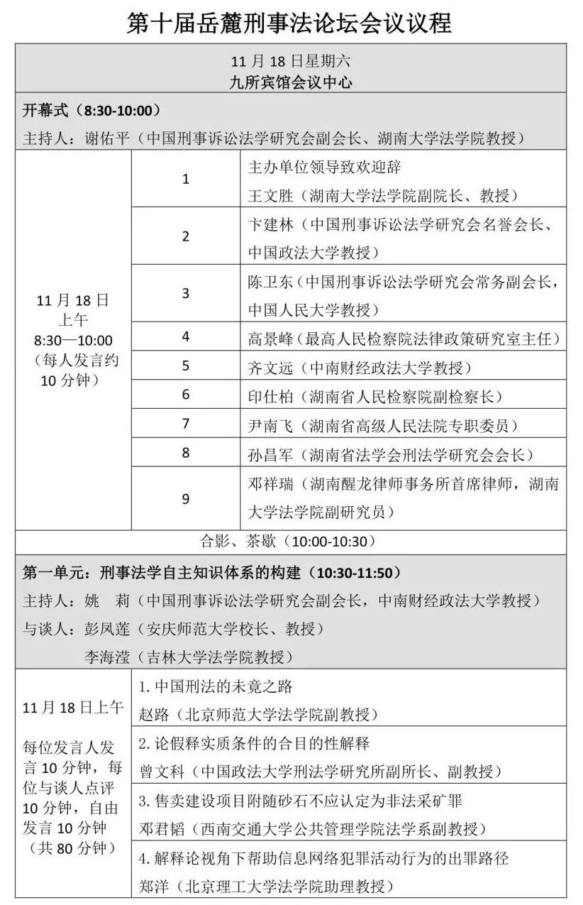 由五楼自拍 、五楼自拍 刑事法律科学研究中心、五楼自拍 国家腐败预防与惩治研究中心主办、湖南醒龙律师事务所协办的第十届岳麓刑事法论坛将于2023年11月18日、19日在九所宾馆会议中心举办,会期1天半。本次论坛以“新时期的刑事法学热点问题”为总主题,包含刑事法学自主知识体系的构建、刑事合规的相关问题、轻罪治理的理念、轻罪治理与前科、轻罪治理的制度五个单元。会议的具体议程如下: