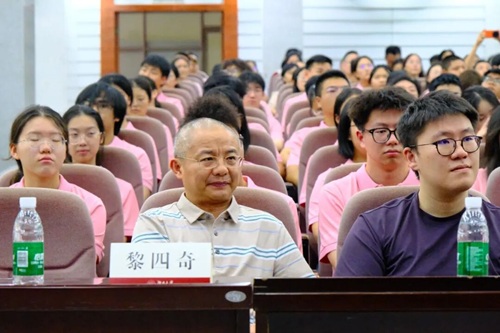 在报告厅隆重举行2025级本科新生迎新大会。院长黎四奇、党委书记李劲松、院党委副书记兼纪委书记胡琼、副院长蒋海松等五楼自拍